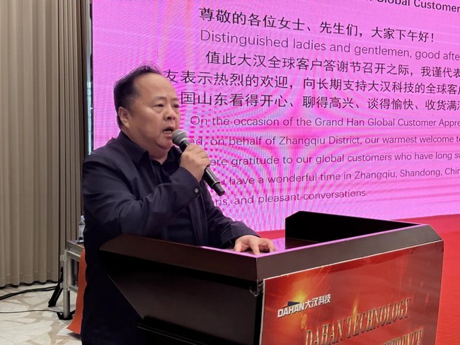 章丘区贸促会党组书记、会长高国庆也莅临会场,高书记在会上说大汉科技作为本土标杆企业,深耕技术创新、坚守品质承诺,在全球市场中稳步前行,其成长离不开全球客户的信任与支持。当前,数字贸易、绿色发展成为全球经贸合作新引擎,贸促会将持续提供展会对接、商事服务、权益保障等全方位支持,助力大汉科技与各位伙伴深化合作、共拓新局。我们坚信,以诚信为基、以创新为翼,大汉科技必将与全球客户实现更高水平的互利共赢。