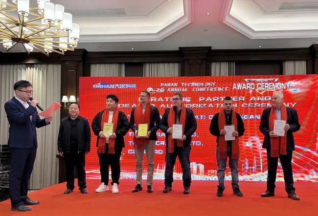 在颁奖环节,大汉科技对甄出的全球11家战略客户和大客户经销商颁发了奖牌。